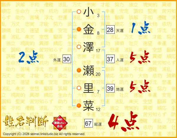 小金澤瀬里菜さんの総運は67画の4点!