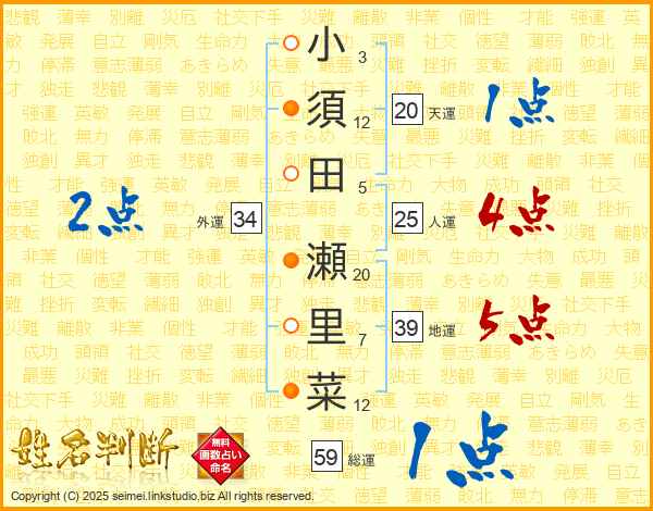 小(3画)須(12画)田(5画) 瀬(20画)里(7画)菜(12画)