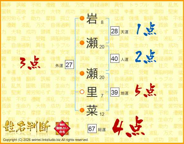 岩(8画)瀬(20画) 瀬(20画)里(7画)菜(12画)