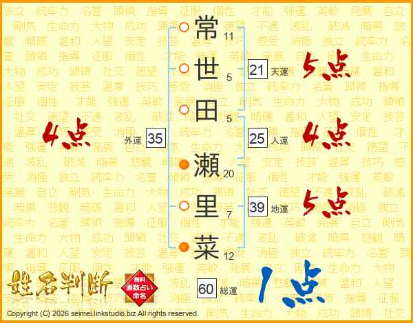 常(11画)世(5画)田(5画) 瀬(20画)里(7画)菜(12画)