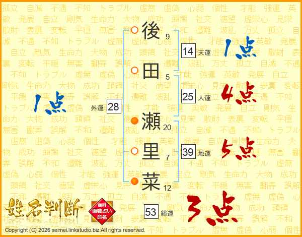後(9画)田(5画) 瀬(20画)里(7画)菜(12画)