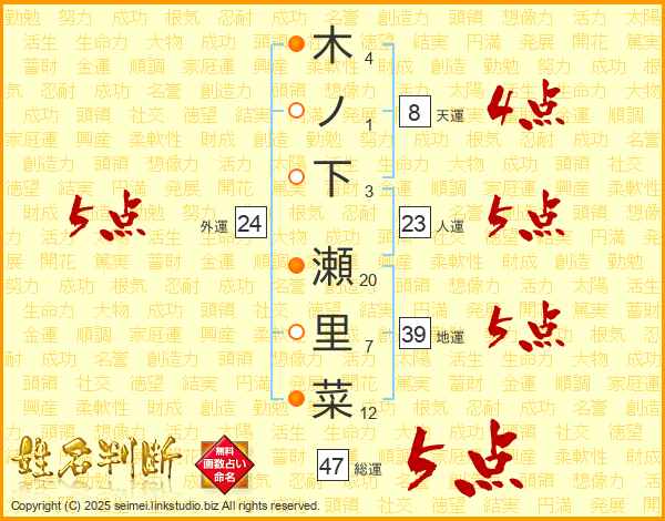 木(4画)ノ(1画)下(3画) 瀬(20画)里(7画)菜(12画)