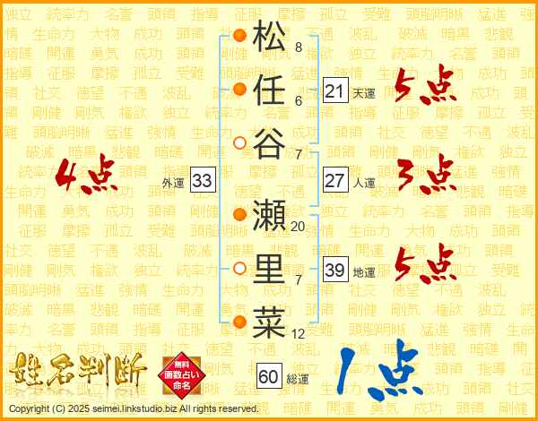 松(8画)任(6画)谷(7画) 瀬(20画)里(7画)菜(12画)