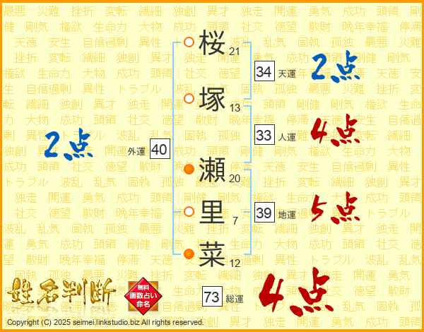 桜(21画)塚(13画) 瀬(20画)里(7画)菜(12画)