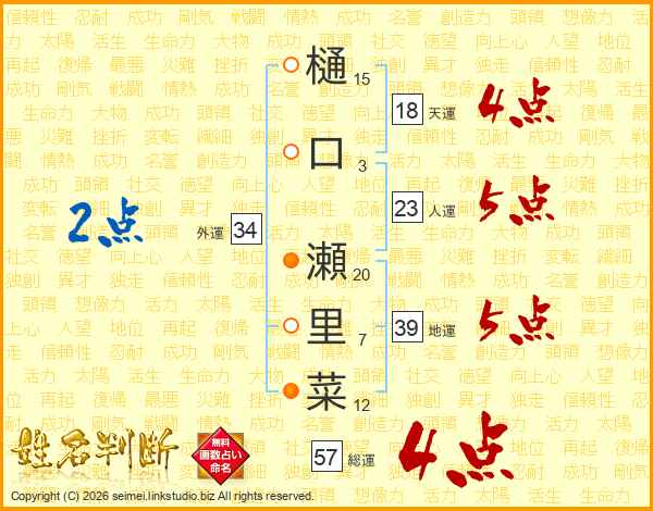樋(15画)口(3画) 瀬(20画)里(7画)菜(12画)