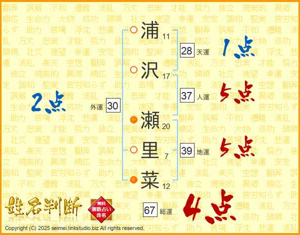 浦沢瀬里菜さんの総運は67画の4点!