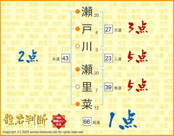 瀬戸川瀬里菜さんの地運は39画の5点!
