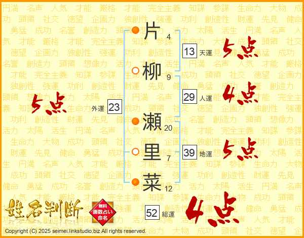 片(4画)柳(9画) 瀬(20画)里(7画)菜(12画)