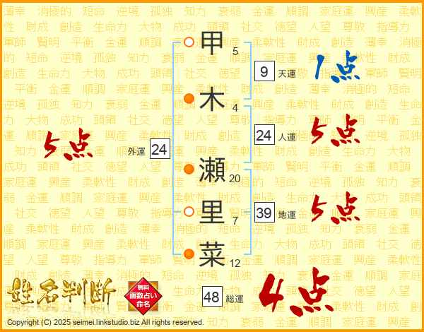 甲(5画)木(4画) 瀬(20画)里(7画)菜(12画)