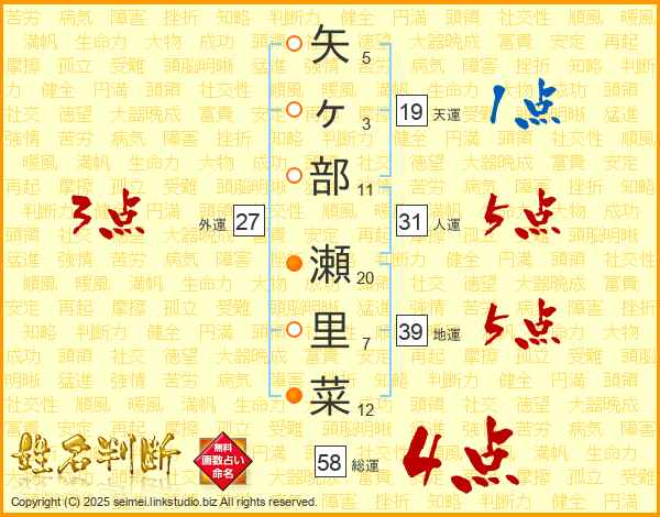 矢ヶ部瀬里菜さんの総運は58画の4点!