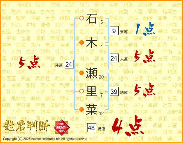 石(5画)木(4画) 瀬(20画)里(7画)菜(12画)