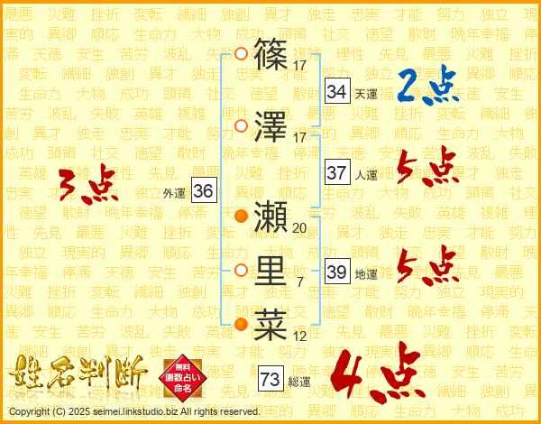 篠(17画)澤(17画) 瀬(20画)里(7画)菜(12画)