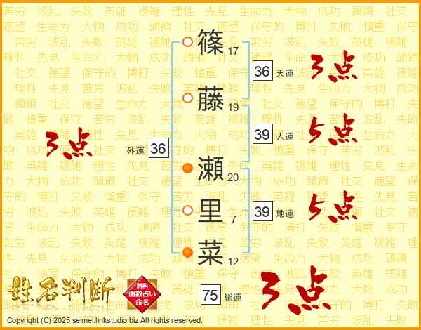 篠(17画)藤(19画) 瀬(20画)里(7画)菜(12画)