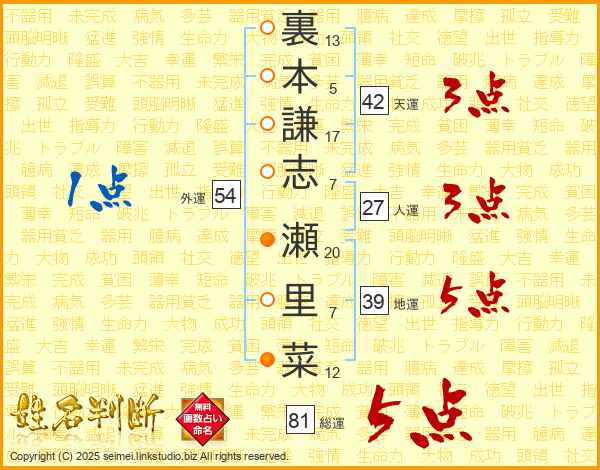 裏本謙志瀬里菜さんの総運は81画の5点!