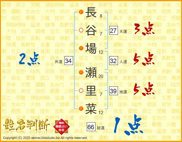 長谷場瀬里菜さんの総運は66画の1点!