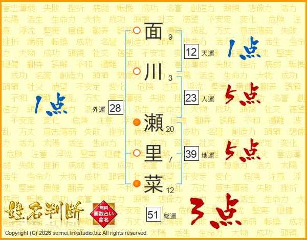 面(9画)川(3画) 瀬(20画)里(7画)菜(12画)