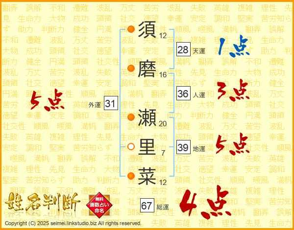 須磨瀬里菜さんの総運は67画の4点!