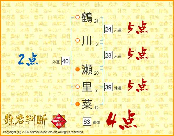 鶴(21画)川(3画) 瀬(20画)里(7画)菜(12画)