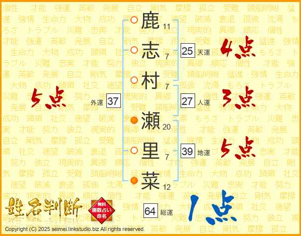 鹿志村瀬里菜さんの外運は37画の5点!