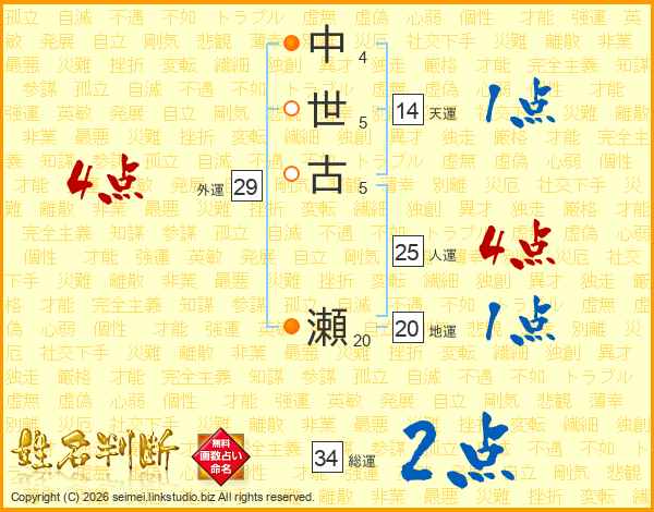 生活面を象徴する運勢です。外部から受ける影響力を表し、結婚運、家庭運や職場、環境への順応性を表します。総運から人運を引いた画数。姓や名が1文字の場合を除く。