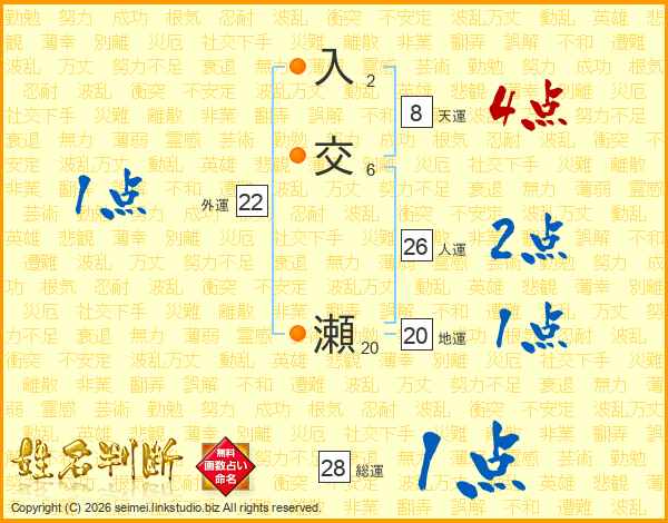 生活面を象徴する運勢です。外部から受ける影響力を表し、結婚運、家庭運や職場、環境への順応性を表します。総運から人運を引いた画数。姓や名が1文字の場合を除く。