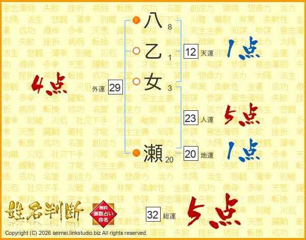 八(8画)乙(1画)女(3画) 瀬(20画)
