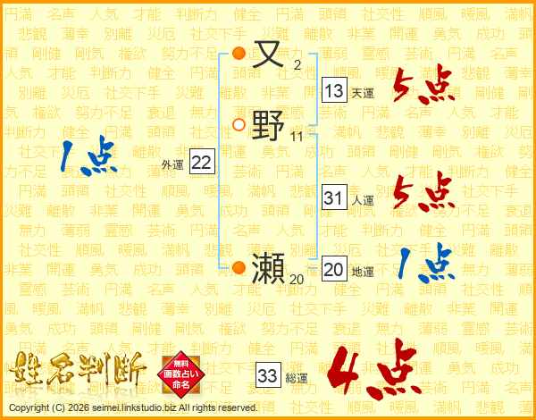 又野瀬さんの総運は33画の4点