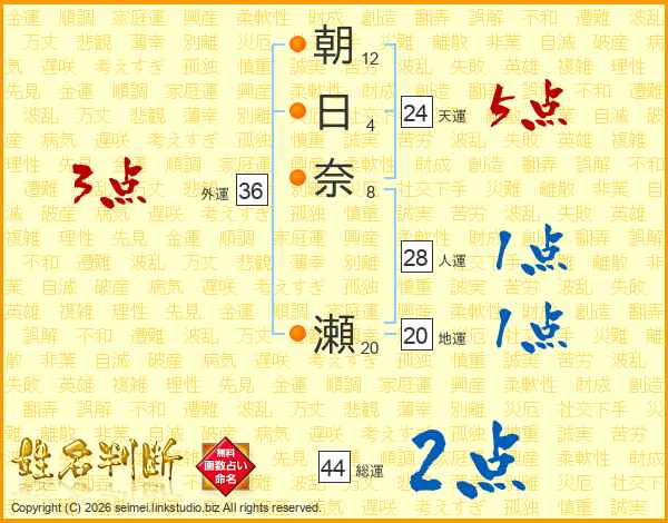 朝(12画)日(4画)奈(8画) 瀬(20画)