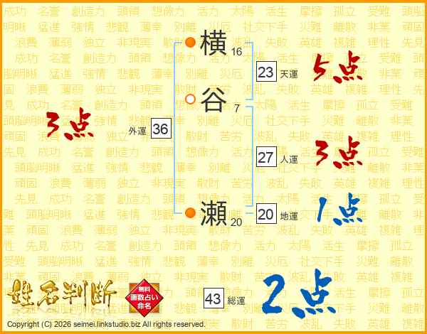 横谷瀬さんの総運は43画の2点