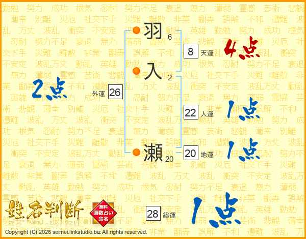 羽入瀬さんの総運は28画の1点!