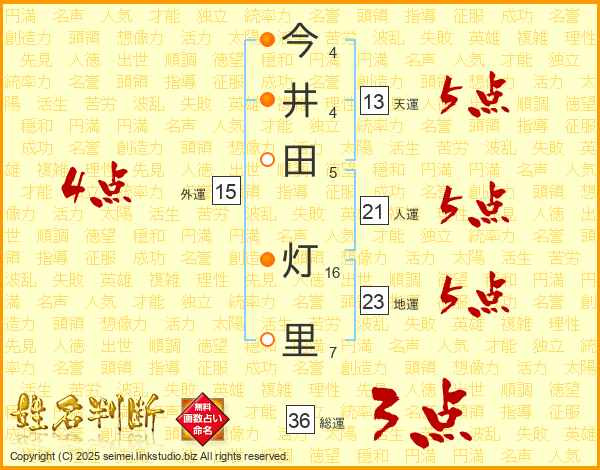 今(4画)井(4画)田(5画) 灯(16画)里(7画)