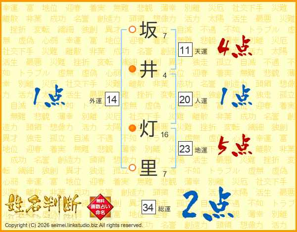 坂(7画)井(4画) 灯(16画)里(7画)