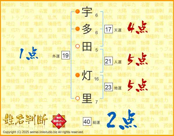 宇(6画)多(6画)田(5画) 灯(16画)里(7画)