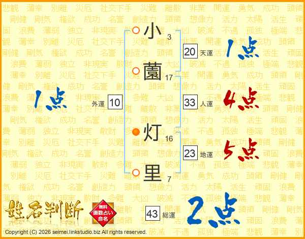 生活面を象徴する運勢です。外部から受ける影響力を表し、結婚運、家庭運や職場、環境への順応性を表します。総運から人運を引いた画数。姓や名が1文字の場合を除く。