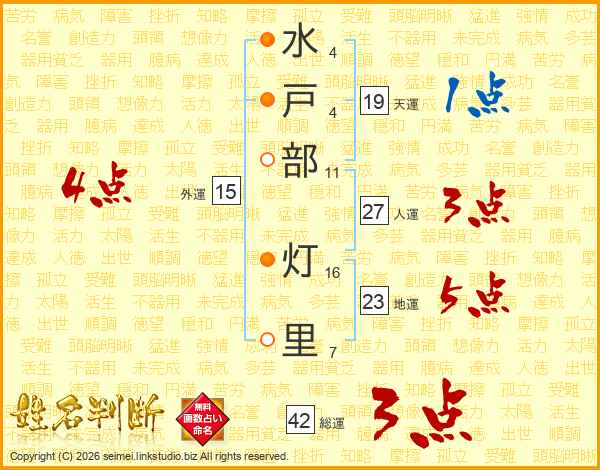 水(4画)戸(4画)部(11画) 灯(16画)里(7画)