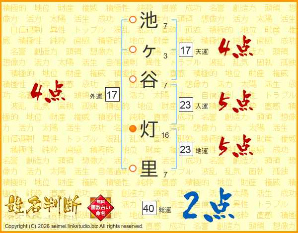 池(7画)ヶ(3画)谷(7画) 灯(16画)里(7画)