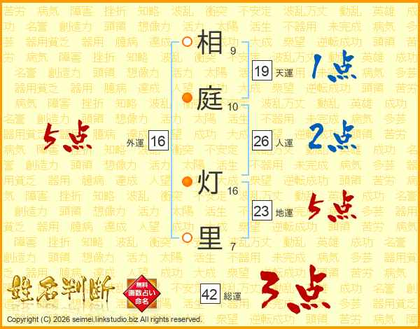 生活面を象徴する運勢です。外部から受ける影響力を表し、結婚運、家庭運や職場、環境への順応性を表します。総運から人運を引いた画数。姓や名が1文字の場合を除く。