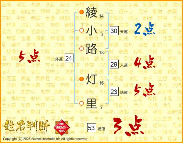 綾小路灯里さんの総運は53画の3点!
