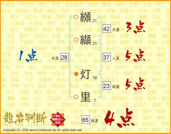 生活面を象徴する運勢です。外部から受ける影響力を表し、結婚運、家庭運や職場、環境への順応性を表します。総運から人運を引いた画数。姓や名が1文字の場合を除く。