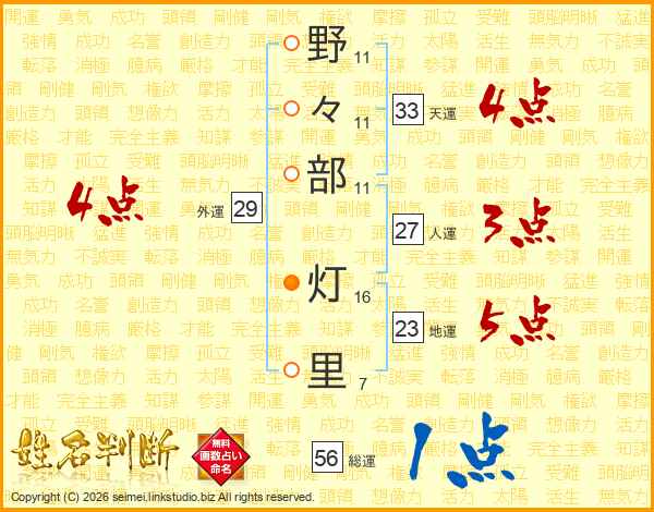 野(11画)々(11画)部(11画) 灯(16画)里(7画)