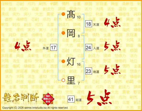 髙(10画)岡(8画) 灯(16画)里(7画)