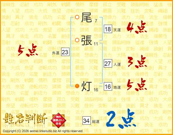 あなたの人生を表す1番重要な運勢です。生涯を通じて影響する総合運となり、主に50歳以降の晩年期に影響を及ぼします。苗字と名前の合計画数。