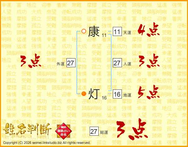 あなたの人生を表す1番重要な運勢です。生涯を通じて影響する総合運となり、主に50歳以降の晩年期に影響を及ぼします。苗字と名前の合計画数。