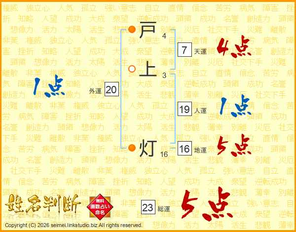 生活面を象徴する運勢です。外部から受ける影響力を表し、結婚運、家庭運や職場、環境への順応性を表します。総運から人運を引いた画数。姓や名が1文字の場合を除く。