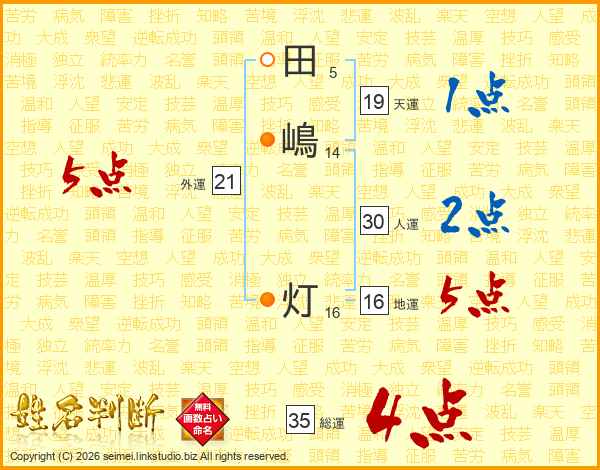 田(5画)嶋(14画) 灯(16画)