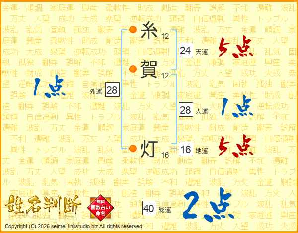 生活面を象徴する運勢です。外部から受ける影響力を表し、結婚運、家庭運や職場、環境への順応性を表します。総運から人運を引いた画数。姓や名が1文字の場合を除く。