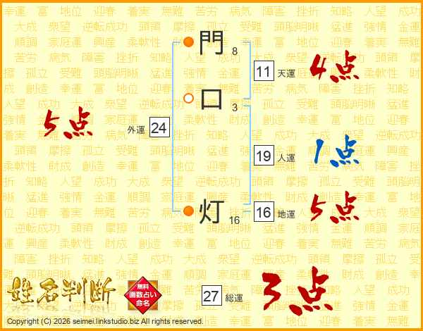生活面を象徴する運勢です。外部から受ける影響力を表し、結婚運、家庭運や職場、環境への順応性を表します。総運から人運を引いた画数。姓や名が1文字の場合を除く。