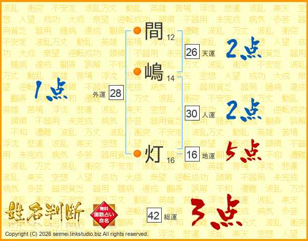 間(12画)嶋(14画) 灯(16画)