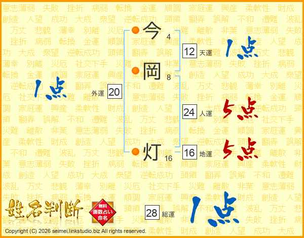 今(4画)岡(8画) 灯(16画)
