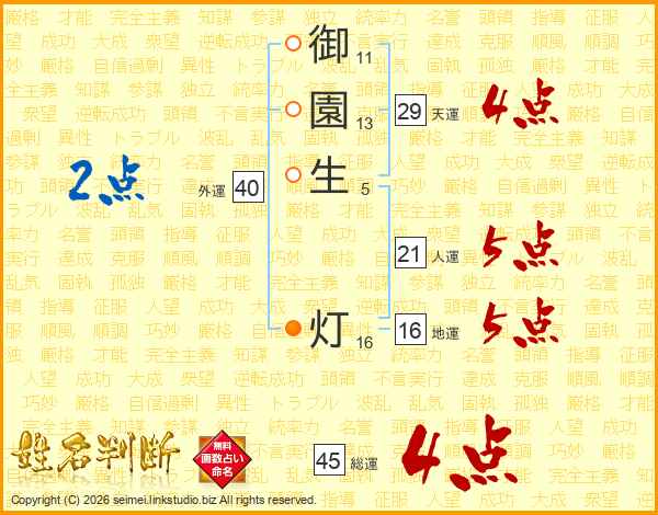 御(11画)園(13画)生(5画) 灯(16画)